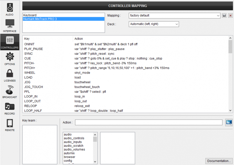 The unit should be visible in the CONTROLLERS tab of Config and the “factory default” available/selected from the Mappings drop-down list. The factory default Mapping offers the functions described in this Manual, however those can be adjusted to your needs via VDJ Script actions.