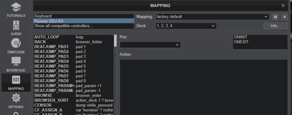 The unit should be visible in the MAPPING tab of VirtualDJ Settings and the “factory default” available/selected from the Mappings drop-down list. The factory default Mapping offers the functions described in this Manual, however those can be adjusted to your needs via VDJ Script actions.
