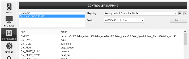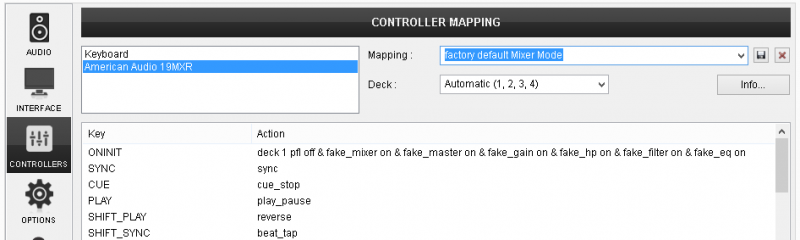 The unit should be visible in the CONTROLLERS tab of Config and 2 different factory default mapping options will be available in the Mappings drop-down list. Make sure the factory default Mixer Mode mapping is selected. The factory default Mapping offers the functions described in this Manual, however those can be adjusted to your needs via VDJ Script actions.