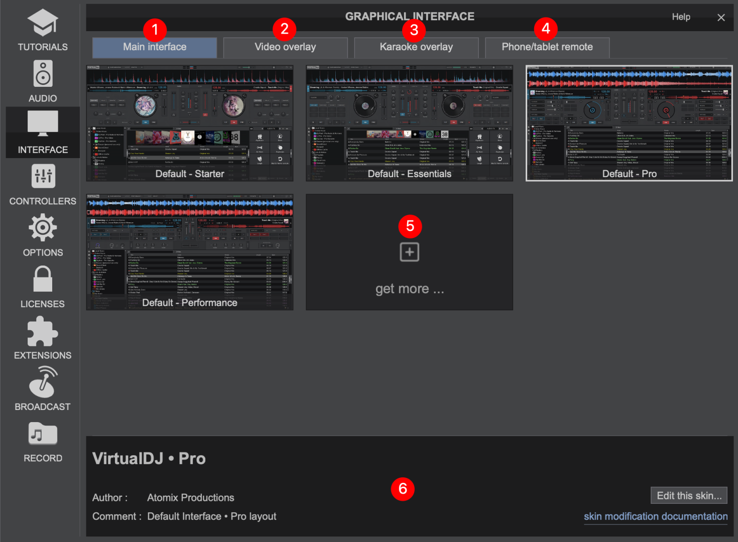 - MAIN INTERFACE - Click to choose and load the desired Interface layout. The default GUI offers Starter, Essentials, Pro, and Performance Layout versions. When additional skins are installed, their thumbnail will appear and can also be selected.