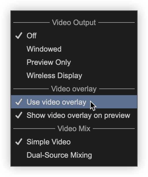 If you wish to turn video overlays on or off for any reason quickly, right click on the video preview window in the Video Mixer and click Use Video Overlay