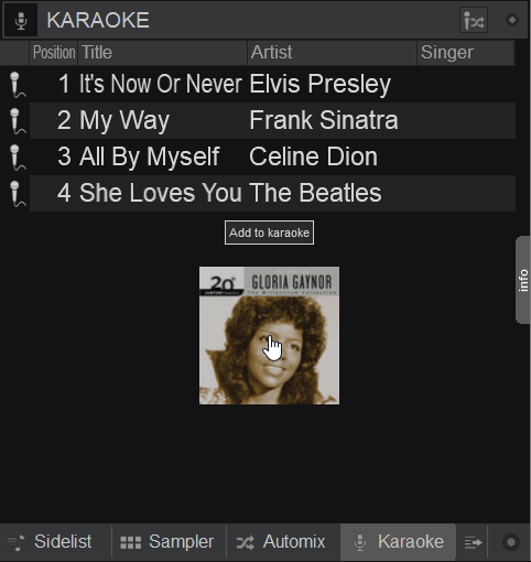 Since the Karaoke Sideview is dependant on singer position, sorting by clicking on the fields in the header are not available like the Sidelist or Automix Sideview panels.
