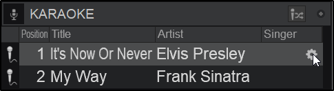Highlight any track in the Karaoke view to reveal the gear icon under the Singer field to add a Singer’s name to the associated karaoke song.