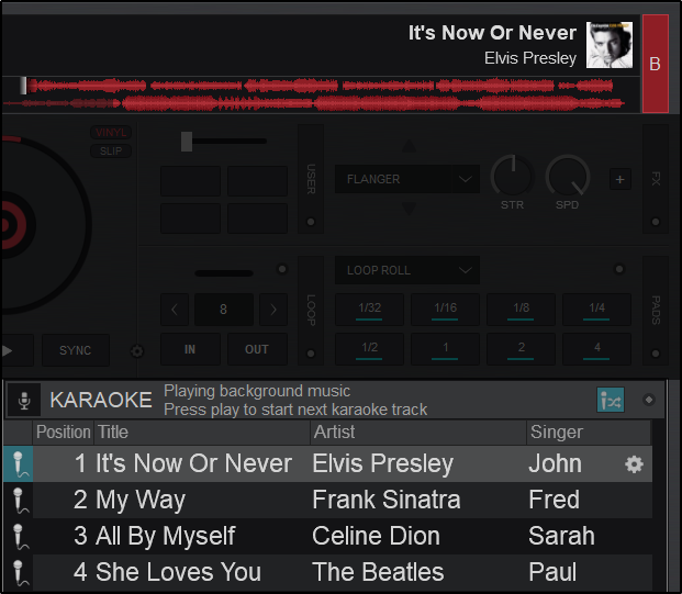 During this time background music (see karaoke options) can be played to fill the space between singers. If background music is selected, a second waveform will be displayed under the karaoke track's waveform in the deck to display it's position and progress.