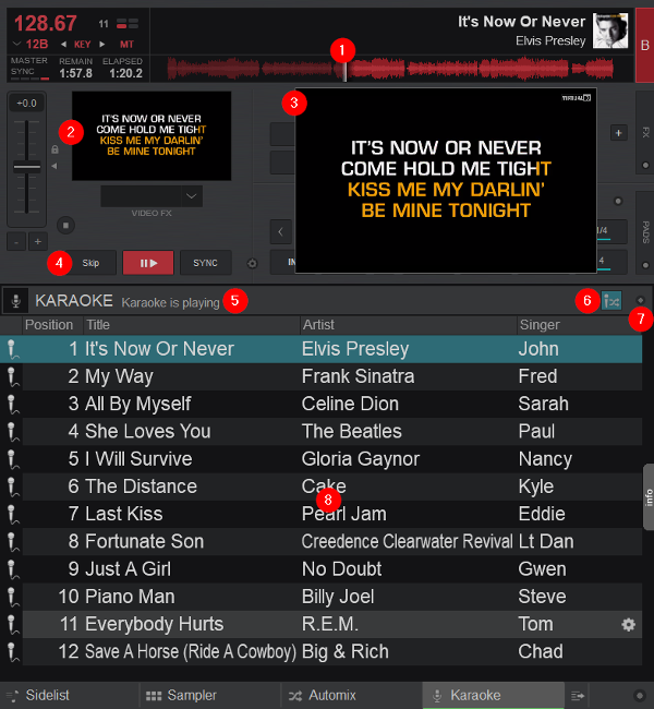 Note: The Karaoke Singer Display can be toggled on and off by mapping a custom button, controller button or keyboard shortcut using the VDJScript karaoke_show.