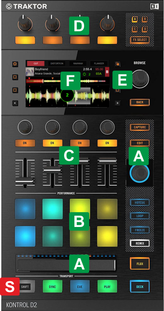 S SHIFT. Hold this button down to access secondary functions of the Kontrol D2.