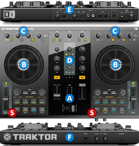 S SHIFT: Hold this button down to access secondary functions of the Kontrol S2 (mainly in white lettering)