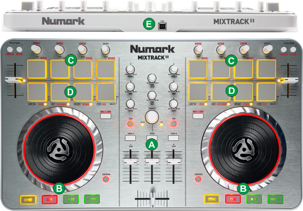 Numark - Mixtrack II LAYOUT The functionality of each button and knob per section (as shown in the image above) will be explained in detail in the next chapters A. Mixer & Browser Controls B. Deck Controls C. Effect Controls D. Pads Mixer