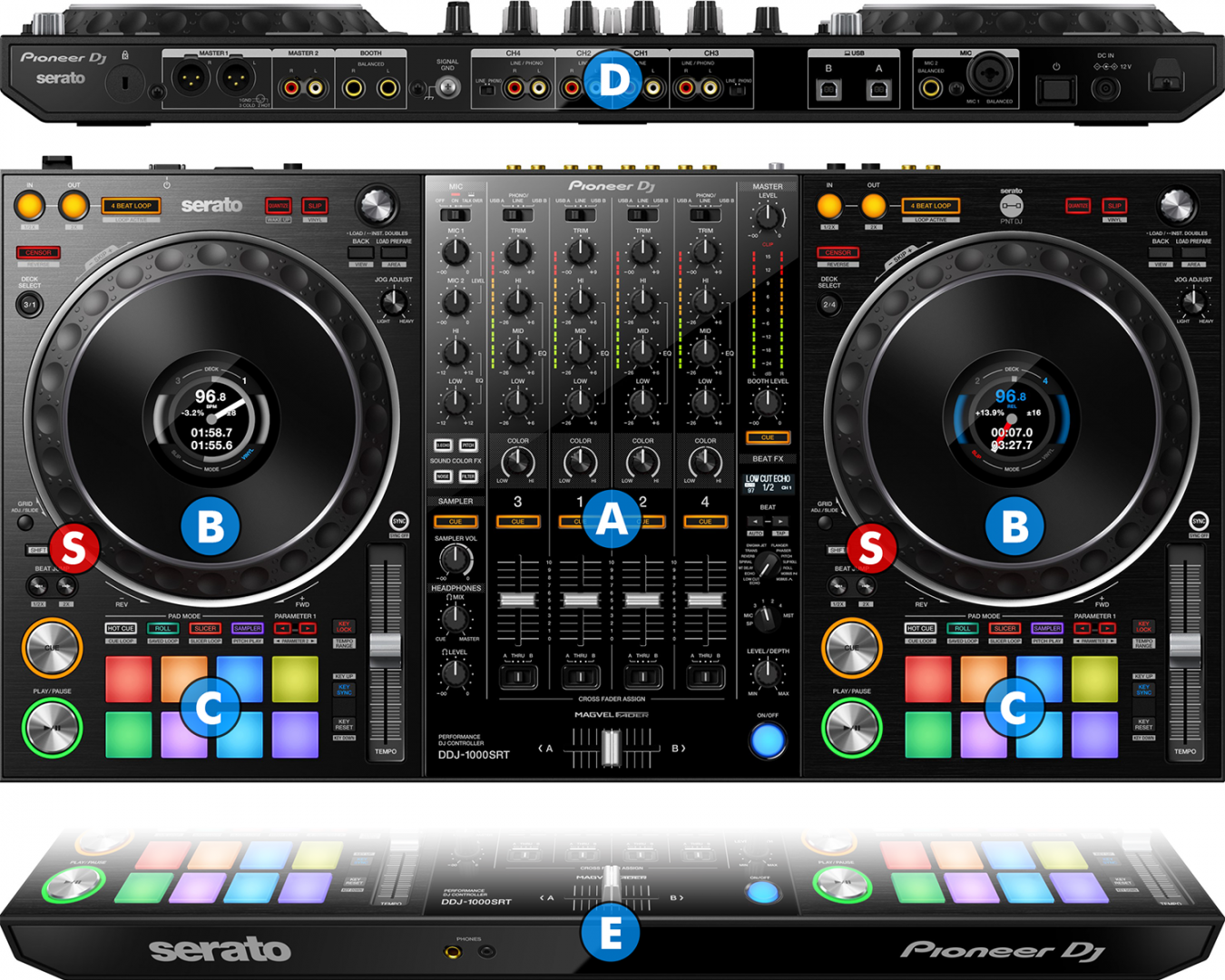 S SHIFT: Hold this button down to access secondary functions of Pioneer DDJ-1000SRT (mainly in black lettering inside a gray box)