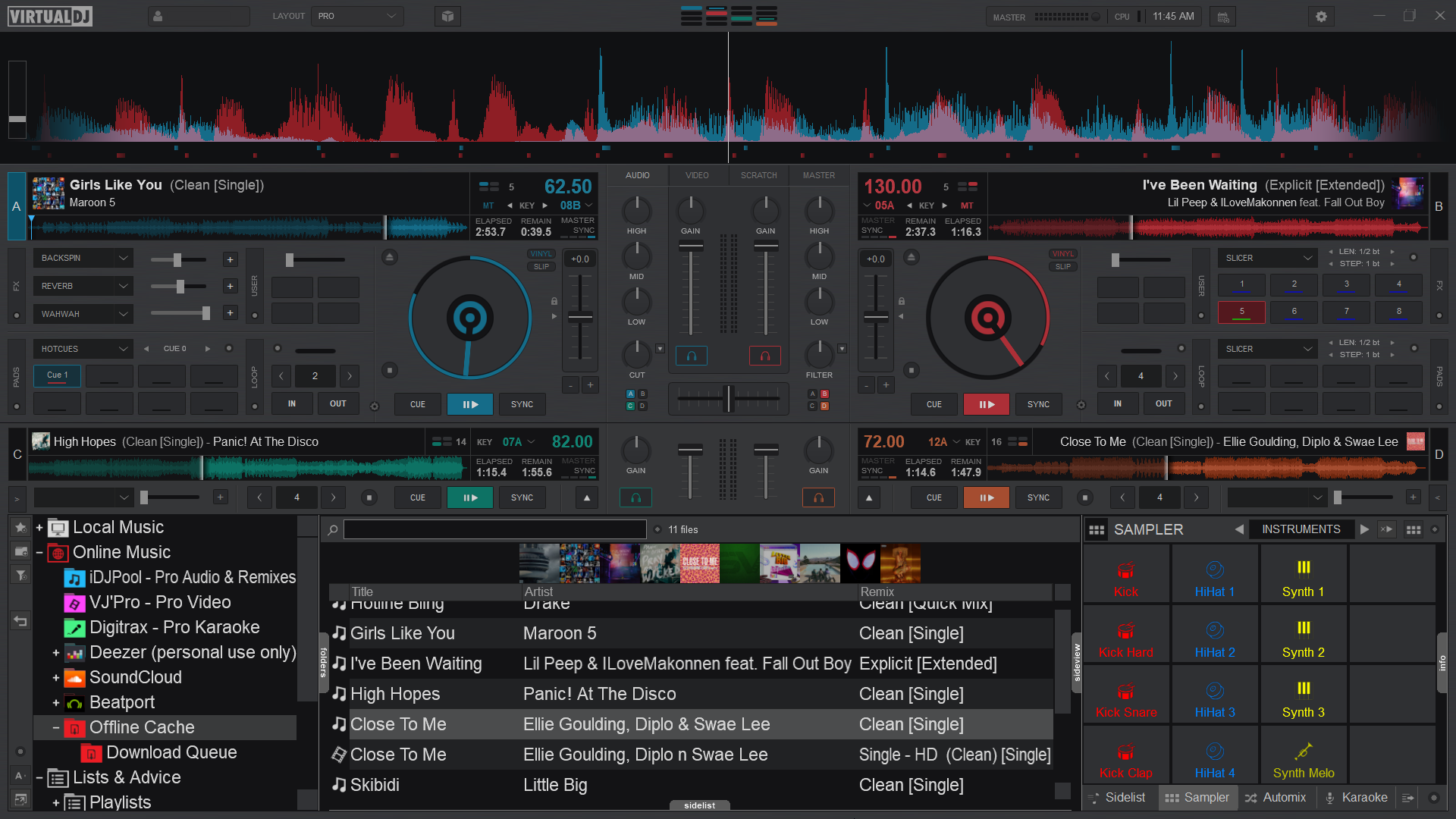 Phrase Bars Phrase Circles 4-DecksDisplays 4-Deck Mode. Once selected additional display options are available. The default display is 4-Deck with a 2+2 Channel Mixer but can be changed to a full 4-Channel Mixer.
