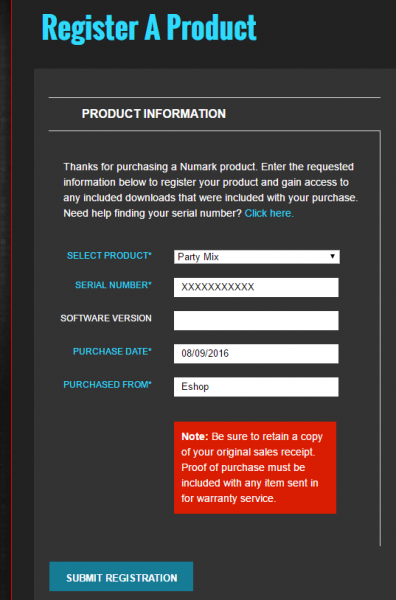 • Register your product by selecting the Party Mix from the Products's lit and providing the serial number of the unit (usually at the bottom of the unit starting with (21), along with all the other purchase information and finally click on the SUBMIT REGISTRATION button.