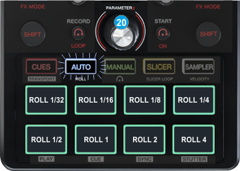 While the Auto Loop mode is selected, press the same AUTO mode button again to set the PADs to Loop Roll mode (led will blink). The Pads section of the default VirtualDJ GUI on the corresponding deck will be also set to the Loop Roll pad page.