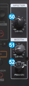 - BOOTH ASSIGN. Choose if a specific mixer channel or the Master Output will be routed to the Booth Output.