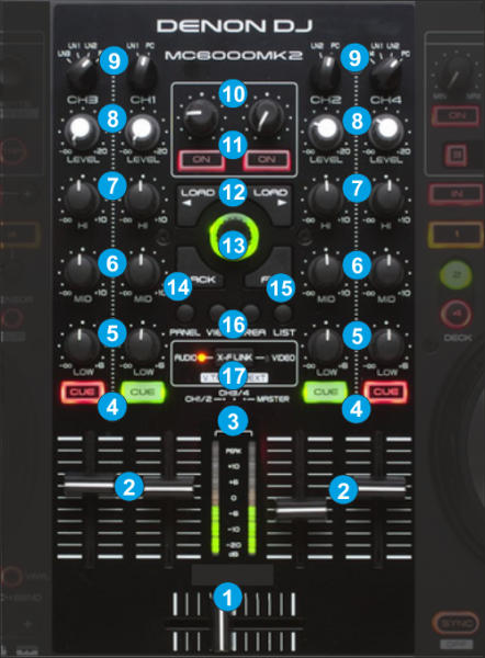 - CROSSFADER. Blends audio between the channels assigned to the left and right side of the crossfader.