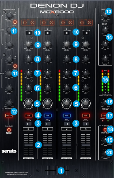 CROSSFADER. Blends audio between the channels assigned to the left and right side of the crossfader.