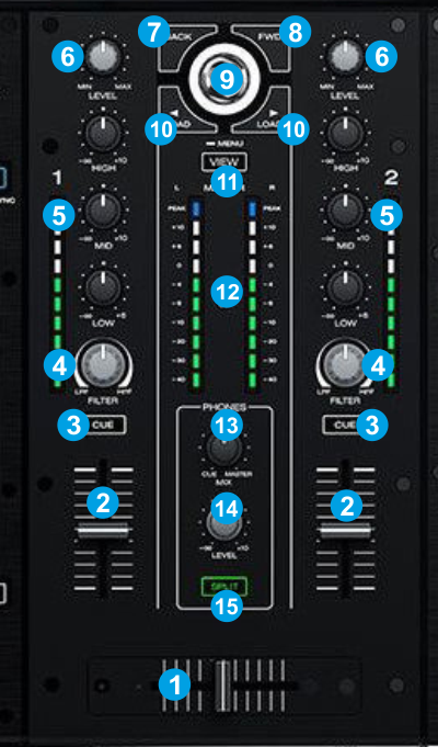 CROSSFADER. Blends audio between the channels assigned to the left and right side of the crossfader.