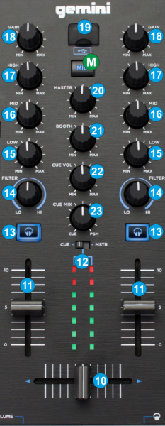 - GAIN. Adjust the Gain (Trim) of the left/right channel/deck. Try to keep lower than the 12 o clock position to avoid distortion.