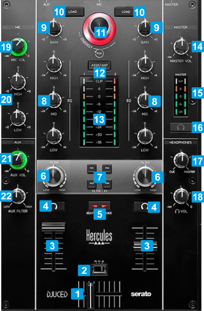 Push to toggle Browser focus between Sideview and Song list12 ASSISTANTUse this button to select the Recommendations folder and get online suggestions based on the currently playing track. Press again to select the previously working folder. 13 VU METERSIndicate the pre-fader level of the Left/Right deck 14 * MASTER VOLAdjust the level of the Master Output (connection at the rear panel). 15 * MASTER VU METERSIndicate the overall output level on the Master Output of the device. 16 * MASTER PFLSends the audio signal from the Master Output to the Headphones channel. Hardware operation, not visible in GUI or controlled from VirtualDJ 17 * HEADPHONES MIXBlends the signal from the Deck or Master PFL and the Master Output in Headphones. 18 * HEADPHONES VOLAdjusts the level of the Headphones Output (connection at the front panel). 19 ** MIC VOLAdjusts the level of the Microphone Input (connection at the rear panel). 20 ** MIC EQ2-Band Equalizer. Adjust the High/Low frequencies of the Microphone Input signal (connection at the rear panel). 21 ** AUX VOLAdjusts the level of the AUX Input (connection at the rear panel). 22 ** AUX FILTERApply a High/Low pass Filter to the AUX input. Notes* These buttons/knobs offer Hardware operations, but may reflect their movements and status on the VirtualDJ GUI (fake mode) and should not be assigned to any other function.