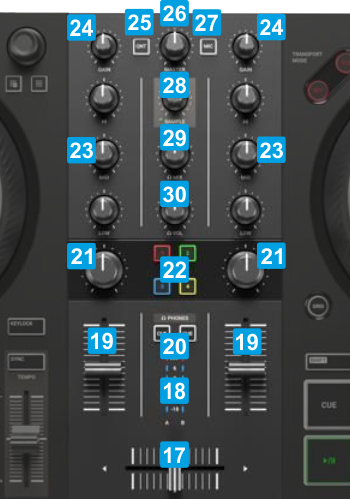 17 CROSSFADERBlends audio between the left and right assigned decks18 VU METERSThe Left/Right series of Leds indicate the pre-fader output level of Left/Right Deck.19 VOLUMEAdjust the Output Volume of the Left/Right Deck.20 CUE (PFL)Select Left/Right Deck to send to the Headphones Channel for pre-listening.21 MIXER FX PARAMAdjust the 1st (Strength)) Parameter of the selected Color FX. When at middle position, no Effect is applied.22 MIXER FX SELECT (1-4)Select and enable/disable a Mixer (Color) Effect. Button 1 : Filter, Button 2 - Echo, Button 3 : Noise, Button 4 : Flanger.23 3 BAND EQAdjust the Low (Bass), Mid and High (Treble) Equalizer frequencies of the Left/Right Deck24 GAINAdjust the pre-fader output level of the Left/Right Deck25 QUANTEnable/disable Quantize mode on both Left and Right Decks. When enabled, hotcues, play, loop etc will be snapped (quantized) to 1 Beat or other value as defined in the VirtualDJ globalQuantize setting26 MASTERAdjust the level of the Master Output (connection at the rear panel). Hardware operation (output volume is controlled by the hardware), but position will be visible on VirtualDJ GUI (fake mode)27 MICTurn Microphone input On/Off (connection at the rear panel). The volume of the Microphone Input is controlled from the rear panel 28 SAMPLER VOLAdjust the Output Master Volume of the VirtualDJ Sampler29 CUE MIXBlends Master Output signal and audio signals from PFLed Decks to the Headphones Output. When at minimum position, only Decks that have the PFL/CUE enabled, will be heard to the Headphones. When at maximum position, only the Master Output will be heard in Headphones30 CUE VOLAdjust the Output Volume of the Headphones Channel (connection at the front panel). Hardware Operation (Headphones Volume is controlled from the Hardware), but its position and value will be also shown at the VirtualDJ GUI (fake mode) Pads