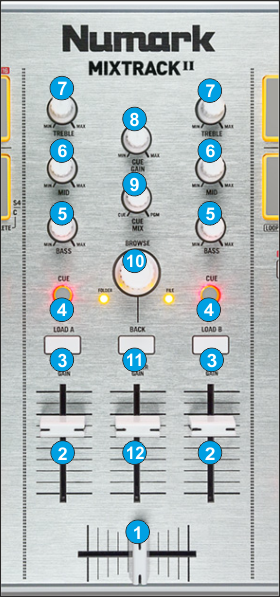 - CROSSFADER. Blends audio between the left and right channels.