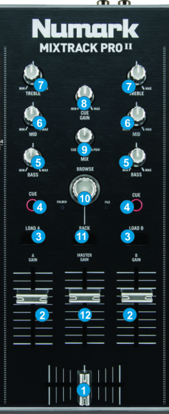 - CUE MIX: Turn to mix between Cue and Master in the Headphone channel. When all the way to the left, only channels routed to Cue will be heard. When all the way to the right, only the Master Output will be heard.
