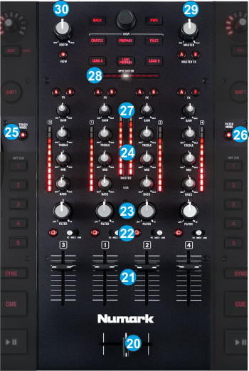 PFL Press these buttons to send this channel's pre-fader signal to the Cue Channel for monitoring. When engaged, the button will be lit. By pressing one PFL button at a time, you will cue that channel alone (and deactivate PFL monitoring for the other channels). To cue to multiple channels simultaneously, press the PFL buttons for those channels at the same time. - FILTER. Applies a resonance Filter on the software decks. Depending on the FILTER MODE (27) The Filter knob also offers 2 additional functions.