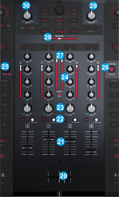 - VOLUME. Volume Faders (mixer channel order is 3-1-2-4 decks). Note that the faders will continue to alter the sound of the corresponding software deck, if the PC-MIC2-LINE switchers are on MIC2 or LINE position.