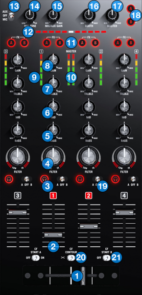 1. CROSSFADER: Blends audio between the channels assigned to the left and right side of the crossfader.