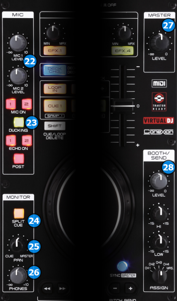- BOOTH EQ HI: Adjust the high frequencies of the booth output.