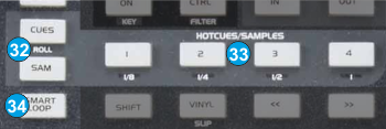 The 4 HOTCUES/SAMPLES multi-buttons (33) offer different functionality depending on the selected mode.