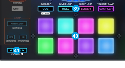 Use the PARAMETER < > buttons (41) to adjust the Parameter 1 (if available) of the selected Pads page
