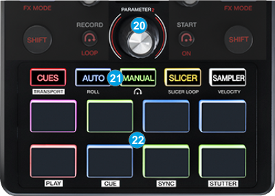 Pads (22) offer 10 different modes, depending on the PAD MODE SEL buttons (21). press the 5 PAD MODE buttons to select the Hotcues, Auto Loop, Manual Loop, Slicer and Sampler modes respectively. While one of the main modes is selected, press the same PAD MODE button again to access the additional Transport, Loop Roll, Saved Loops, Beatjump and Sampler Velocity modes (the LED will blink as an indication). The Pads are assigned to control the PADS section of the VirtualDJ 8 default skins and each time a mode is selected from the AFX the respective PADS page will be auto-selected on the VirtualDJ GUI.