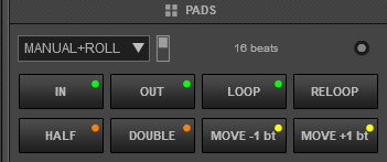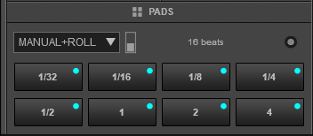 Press the LOOP mode button [P2] to set the 8 bottom Pads to Manual & Roll Loop mode. The Manual+Roll Pads page will be also displayed on the GUI of VirtualDJ, reflecting the operation of the 16 Pads. Hold SHIFT down and then press the P2 button to toggle the view between Pads 1 to 8 and Pads 9 to 16.
