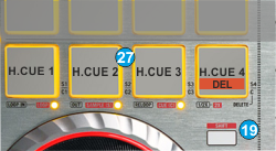 Hold SHIFT down and then press the 3rd PAD from left to set the lower PADs to HotCues mode. The small orange led right below the 3rd PAD will be lit to indicate the selected mode.Each one of the 4 lower PADs (27) assigns a Hot Cue Point (1 to 4) or returns the track to that Hot Cue Point. When a Hot Cue Button is unlit, you can assign a Hot Cue Point by pressing it at the desired point in your track. Once it is assigned, the Hot Cue Button will light. To return to that Hot Cue Point, simply press it.
