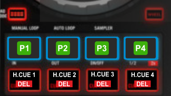 P5 CUE 1Assigns or jumps (if assigned) to Hot Cue 1Deletes Hot Cue 1 P6 CUE 2Assigns or jumps (if assigned) to Hot Cue 2Deletes Hot Cue 2 P7 CUE 3Assigns or jumps (if assigned) to Hot Cue 3Deletes Hot Cue 3 P8 CUE 4Assigns or jumps (if assigned) to Hot Cue 4Deletes Hot Cue 4 MANUAL LOOP MODE