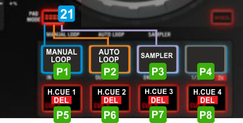 21 + P1Set Pads 1 to 4 to Manual Loop mode 21 + P3Set Pads 1 to 4 to Auto Loop mode 21 + P2Set Pads 1 to 4 to Sampler mode HOTCUES