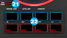 To enter Sampler mode hold this button and press the 3rd pad. - Performance Pads: The upper row of pads has different functions depending on their mode: Manual Loop mode, Auto Loop mode, and Sampler mode.