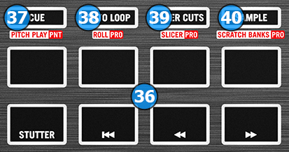 36 PADS 1-8Performance Pads offering different functionality depending on the selected modeDifferent functionality depending on the selected mode37 CUESets Pads to Hotcue modeSets Pads to Cue-Loop mode (led will blink) 38 AUTO LOOPSets Pads to Loop modeSets Pads to Saved Loops mode (led will blink) 39 FADER CUTSSets Pads to Fader Cuts mode. A hardware/internal mode in which Pads perform a on-beat Crossfader movement pattern, simulating Scratch40 SAMPLESets Pads to Sampler modeSets Pads to Key Cue mode (led will blink) Front & Rear