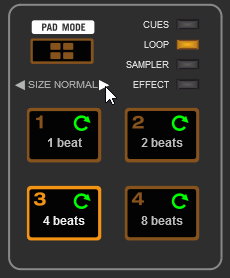 In this mode, the 4 numbered Pads trigger an auto-Loop of a different size in beats, depending on the selected Loop Bank.