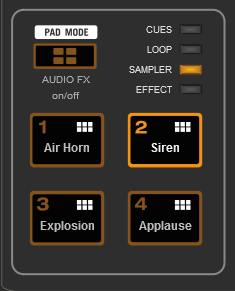 In this mode, the 4 numbered Pads will trigger a Sample (1-4) from the selected Sampler Bank of VirtualDJ.