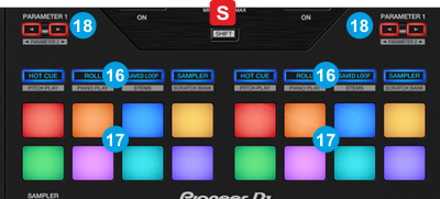 Primary modes : Press any of the 4 available Pad mode buttons to set the Pads to Hotcues, Roll, Saved Loops and Sampler mode. The mode button will be lit in blue