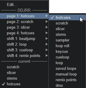 If a controller is connected to VirtualDJ, the Controller name will be displayed in the Page Menu and it will display the various pages assigned to the page buttons on the device. While hardware devices usually have a predefined silk screen for various pad functions such as Hot Cues, Samples, Loops, etc; VirtualDJ provides the ability to change these Pad Page modes directly from within the software in order for you to customize the hardware layout.