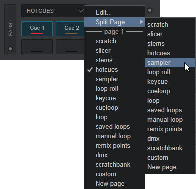 To create a Split Page be sure you are on the initial page that you wish to split and click on the drop-down menu. Select Split Page and select the 2nd page that you wish to take the position of the lower pads.