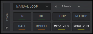 Right clicking (shift) the pads will give additional loop controls to adjust an enabled loops IN or OUT point as well as Move the entire loop with the use of the Jogwheel. Smart Loop, Loop Back and Quantize modes can be toggled on and off, and the entire loop can be moved forward or backwards by 100%.