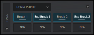 The Remix Points page offers all available Remix Points that have been either automatically analyzed by VirtualDJ or created in the POI Editor. Clicking on an empty pad (N/A) will add a Remix Point to the tracks current position. Remix points are managed in the POI Editor.
