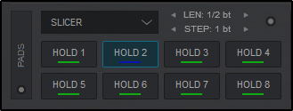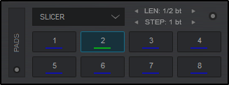 Slicer provides the ability to slice up a track similar to a loop roll. The track is divided into 8 steps (1 beat by default) that move along with each beat (step) of the track. Pressing each Pad will loop (slice) the last displayed step. When the pad is released, the track will continue to play from the position that it would have been in as if nothing happened at all.