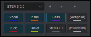 The Stems page provides the ability to instantly use Acapellas and Instrumentals, or mute Vocals, Instruments, Bass, and Drums (Kick and HiHat) from the actively playing track in the deck in order to create remixes and/or mash-ups on the fly.
