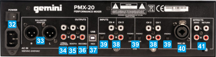 32 POWERConnect PMX20 to an AC socket and power on when all other connections are done 33 MASTER XLRBalanced Master Output. Connect your amplifier (or a pair of amplified speakers) to this output using standard XLR cables. The level of this output is controlled by the MASTER VOL knob at the top panel34 MASTER RCAAlternative unbalanced Master Output. Connect your amplifier (or a pair of amplified speakers) to this output using standard RCA cables. The level of this output is controlled by the MASTER knob at the top panel35 BOOTHSecondary unbalanced Output. Connect your amplifier (or a pair of amplified speakers) to this output using standard RCA cables. The level of this output is controlled by the BOOTH knob at the top panel36 RECRecording unbalanced Output. Connect a Recording device to this output to record your mix37 USBConnect this socket to a USB port of your computer using standard USB cable to allow your computer software to receive and send data to the PMX2038 CH1 to CH4 InputsConnect your analogue sources/devices to these sockets. The audio signal of these sources will be routed to the Master Output in the following cases. - VirtualDJ (or other supported application) is not running (stand-alone) - VirtualDJ is running, the PMX20 is set to Hardware (Mixer) mode and the USB buttons are turned off - VirtualDJ is running with Timecode inputs set in Audio Setup (signal of the Timecode sources) will be muted from output and will be routed to VirtualDJ for DVS control.39 PH/LNSet these switchers to PH position if you have connected devices to the CH1-CH4 inputs respectively, without pre-amp such as Turntables. Set to LN position in other cases.40 MIC INConnect a Microphone to this input, using XLR or 1/4" cable/adapter. The level of the Microphone audio signal is controlled from the MIC LEVEL knob at the top panel. Note that this input is not part of the USB Audio interface, thus the Microphone of the PMX20 cannot be included in the VirtualDJ Audio setup, nor can be controlled or recorded.41 EFFECT SEND/RETURNUse these sockets to connect an external Audio Effect generator device, to receive audio signal from the PMX20 channel (when the FX SEND button is enabled) and return its processed signal adjusted by the RETURN knob at the top panel. This procedure is not operated by VirtualDJ