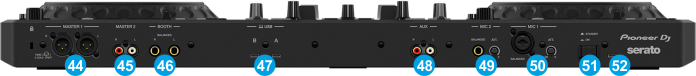 BOOTH OUT: Booth signal output (TRS – Balanced). The level of this output is controlled by the BOOTH LEVEL knob (11) at the top panel. Use it to connect your booth speakers, or an amp that needs different sound output level than master output.