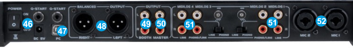 - BOOTH OUTPUT (BALANCED): Use standard RCA cables to connect this output to a booth monitoring system. The level of this output is controlled by the Booth knob on the top panel.